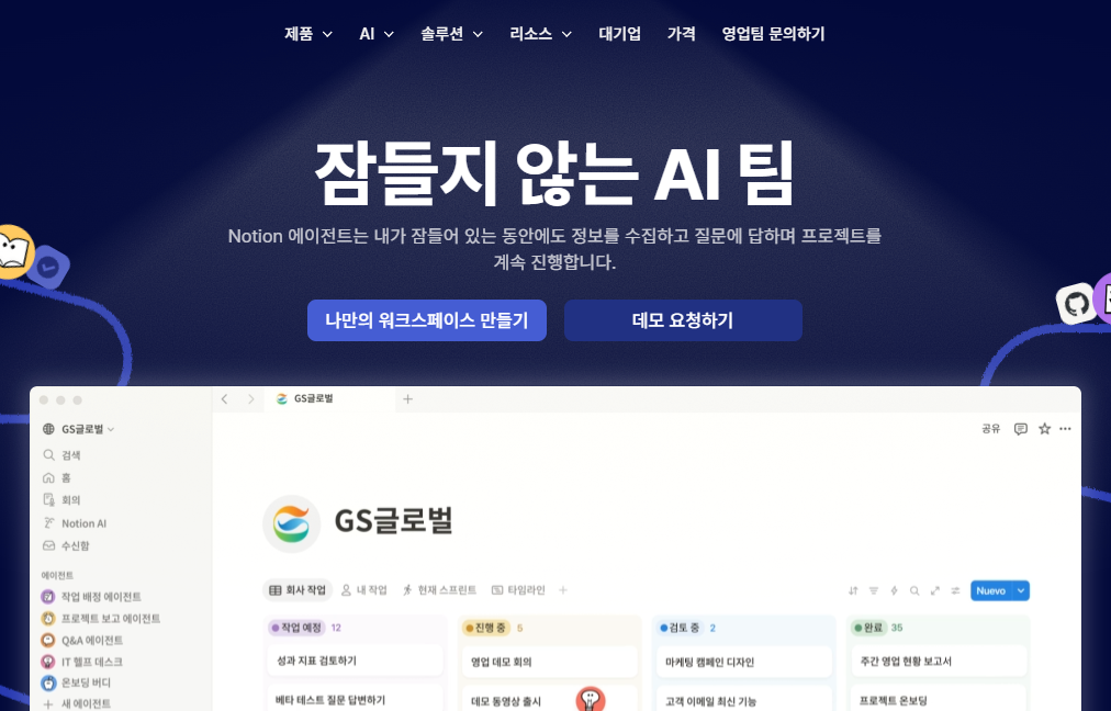 - 핵심 기능: 블록 기반 편집, 데이터베이스(표, 갤러리, 타임라인), 팀 워크스페이스