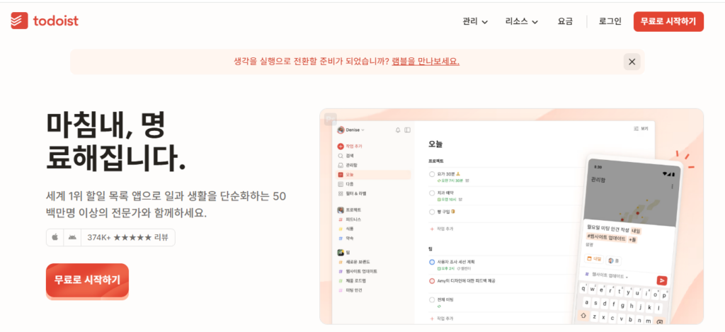 - 핵심 기능: 프로젝트 분류, 하위 작업, 반복 일정, 팀 공유, 라벨 및 필터