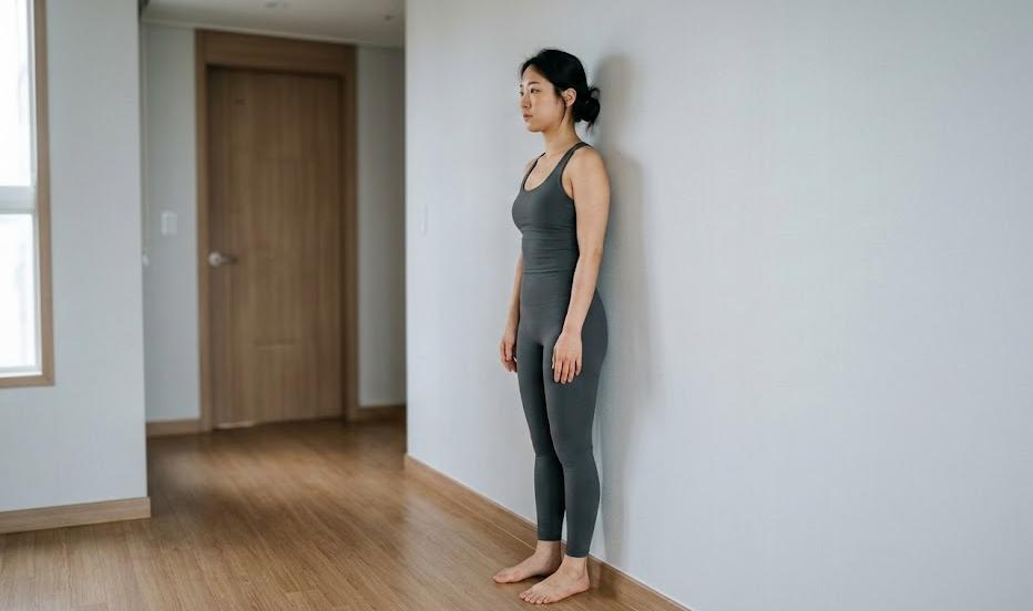 벽에 등을 붙이고 자연스럽게 서봅니다. 발뒤꿈치, 엉덩이, 등 윗부분(날개뼈 사이)을 벽에 붙인 상태에서, 뒤통수도 자연스럽게 벽에 닿는지 확인합니다. 뒤통수가 벽에 닿지 않거나 억지로 힘을 줘야 닿는다면 거북목 가능성이 높습니다.