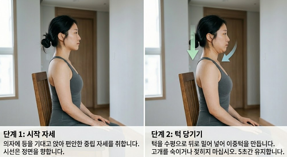 거북목 교정의 가장 기본이 되는 운동입니다. 의자에 등을 기대고 앉은 상태에서, 턱을 뒤로 당겨 이중턱을 만든다는 느낌으로 목을 뒤로 밀어줍니다. 이때 고개를 위아래로 움직이는 것이 아니라, 수평으로 턱을 뒤로 밀어넣는 것이 핵심입니다. 5초간 유지 후 이완, 10~15회 반복합니다. 이 동작은 약해진 심부 목 굴곡근을 강화하고, 짧아진 목 뒤쪽 근육을 늘려줍니다.