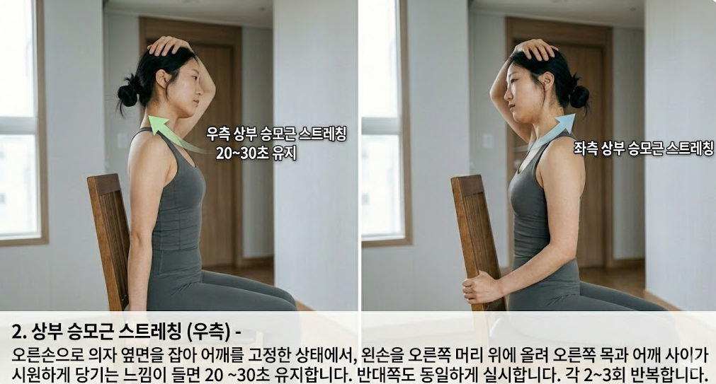 오른손으로 의자 옆면을 잡아 어깨를 고정한 상태에서, 왼손을 오른쪽 머리 위에 올려 머리를 왼쪽으로 부드럽게 당깁니다. 오른쪽 목과 어깨 사이가 시원하게 당기는 느낌이 들면 20~30초 유지합니다. 반대쪽도 동일하게 실시합니다. 각 2~3회 반복합니다.