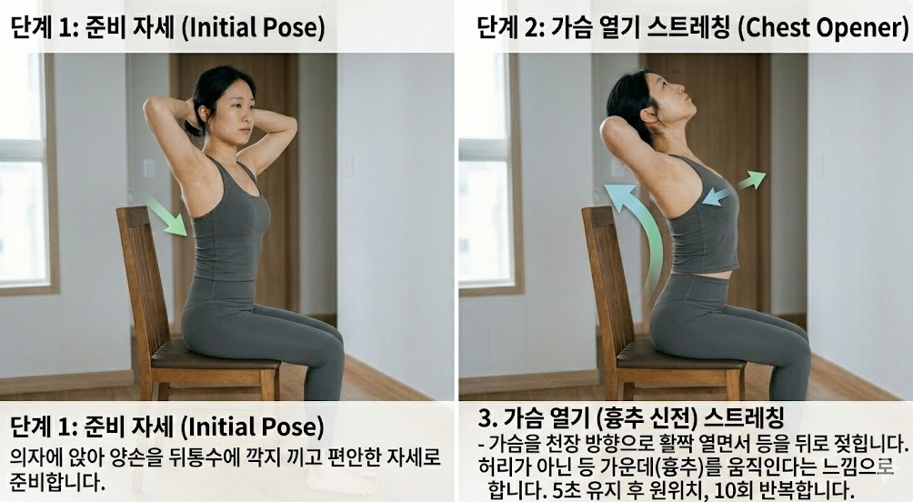 의자에 앉은 상태에서 양손을 뒤통수에 깍지 끼고, 가슴을 천장 방향으로 활짝 열면서 등을 뒤로 젖힙니다. 이때 허리가 아닌 등 가운데(흉추)를 움직인다는 느낌으로 합니다. 5초 유지 후 원위치, 10회 반복합니다. 거북목은 목만의 문제가 아니라 흉추의 과도한 굽음(라운드 숄더)과 함께 발생하는 경우가 많기 때문에, 가슴을 열어주는 스트레칭이 매우 중요합니다.