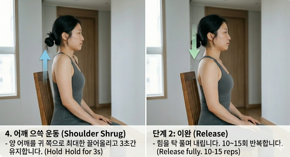 양 어깨를 귀 쪽으로 최대한 끌어올리고 3초간 유지한 뒤, 힘을 탁 풀며 내립니다. 10~15회 반복합니다. 긴장된 승모근 상부를 이완시키고 혈액 순환을 촉진합니다.